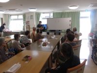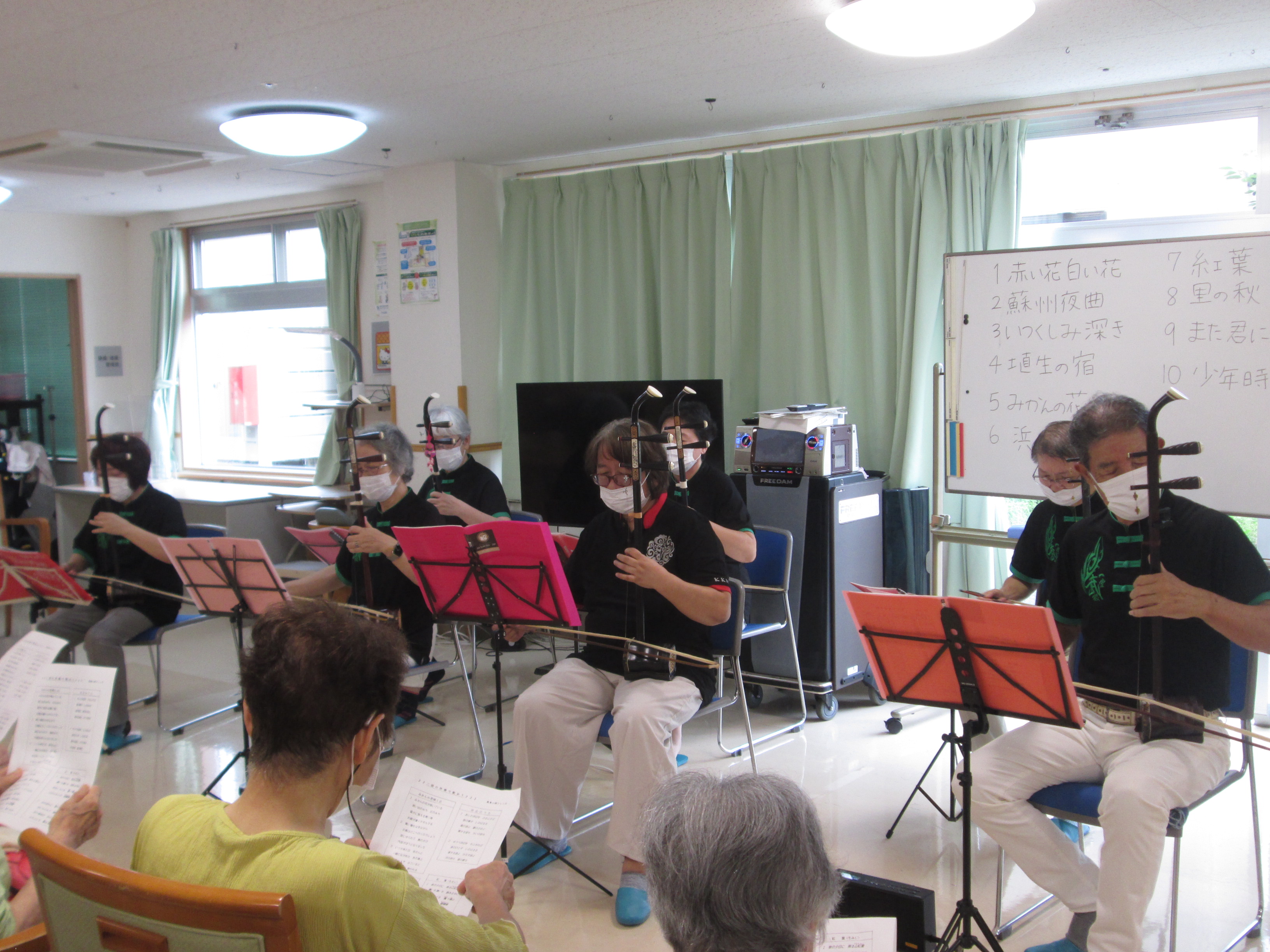 こんにちは、デイサービスです。本日は「美音二胡フレンズ」の皆様が二胡という楽器の演奏にきてくださいました。二胡は中国の伝統的な弦楽器で2本の弦の間に弓を挟んで演奏します。琴筒はニシキヘビの皮で覆われているそうで、実際に近くで見せて下さいました。