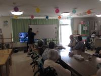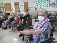 こんにちは、デイサービスです。今日の午後レクはフラダンスの先生に慰問に来てもらいました(^^♪先生がレイを持参してくださったのでご利用者様に首にかけていただきました。今回は観賞するだけでなく、参加型で簡単な振り付けも教えてもらい、坂本九さんの「見上げてごらん夜の星を」に合わせてご利用者様にも踊っていただきました(*^-^*)皆さん初めてとは思えないほどしっかりと振付をマスターしてとても楽しまれていました。最後にご利用者様、職員からの熱いリクエストで先生のフラダンスもしっかりと披露していただけました♪
