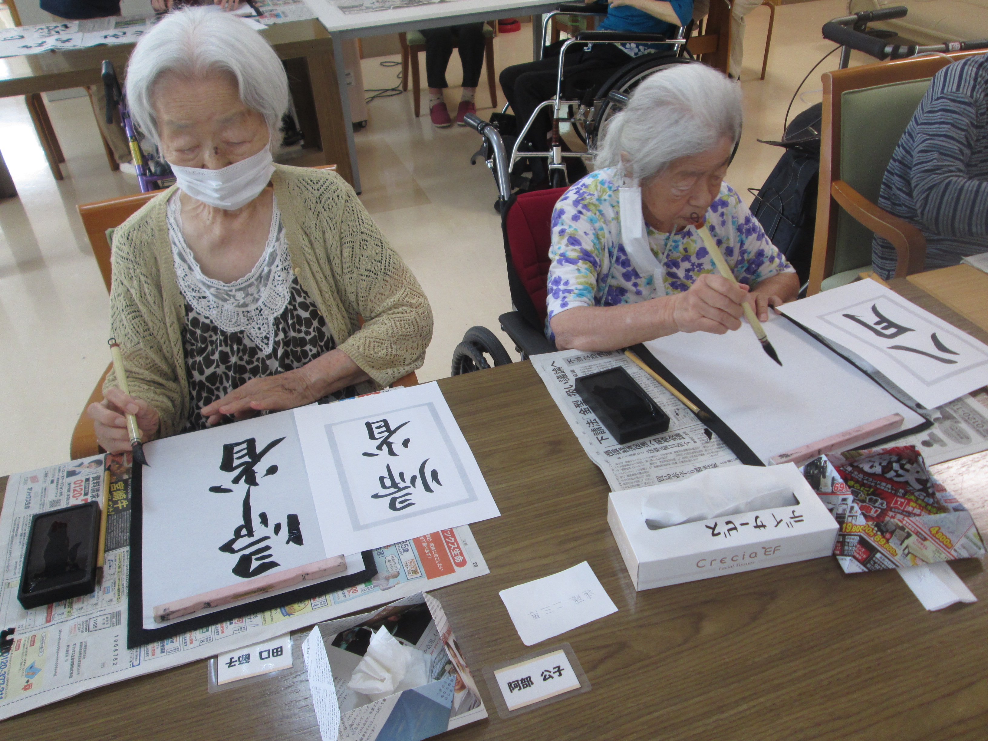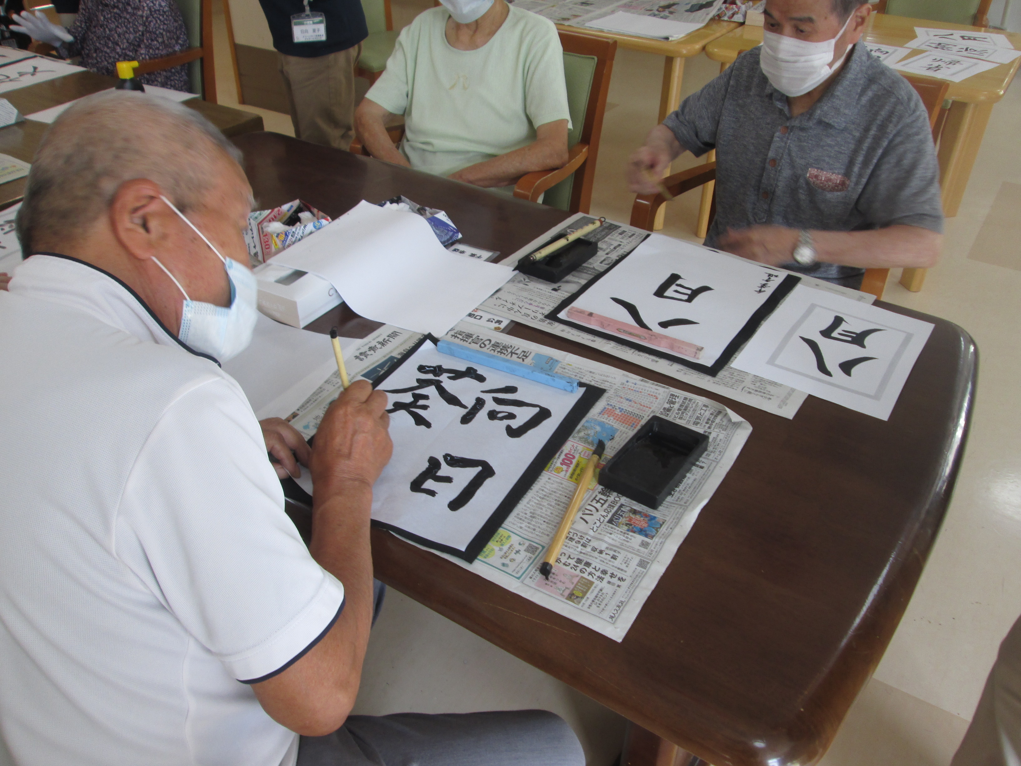 こんにちは、デイサービスです。今日は「八月」「葉月」「納涼」「向日葵」「帰省」「花火」のお手本を使って書道を行いました。敷島デイサービスのご利用者様は書道経験者の方が多く、書道の先生をされていた方もいらっしゃいます(^^♪ 皆さん、ご自分で納得ができる作品になるまで何枚も書き上げてくださいました。たくさんの作品の中からご自分で選んだ自信作をホワイトボードに掲示してお互いの作品を褒め合うまでが書道教室レクの流れとなっています(*^-^*)
