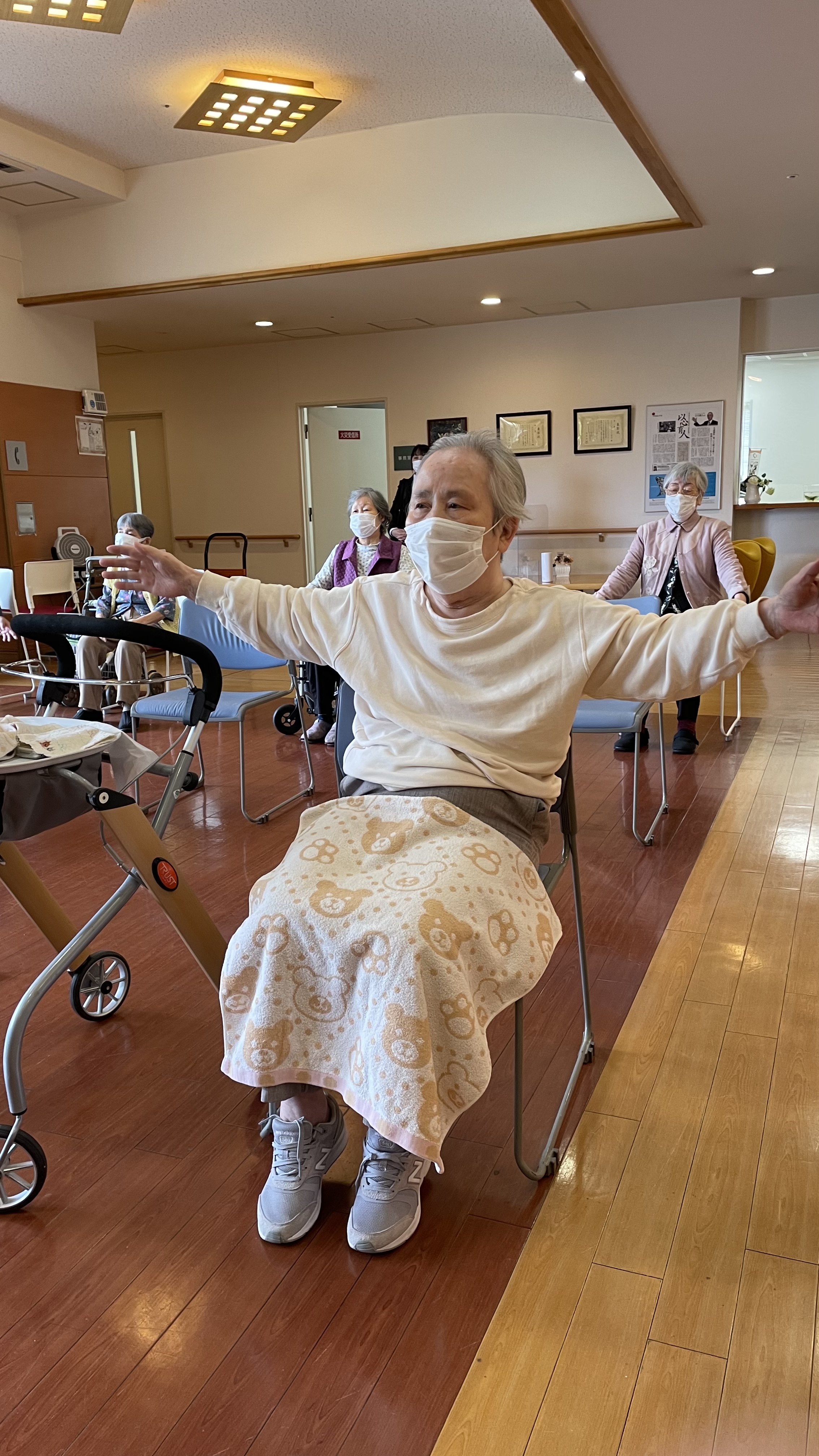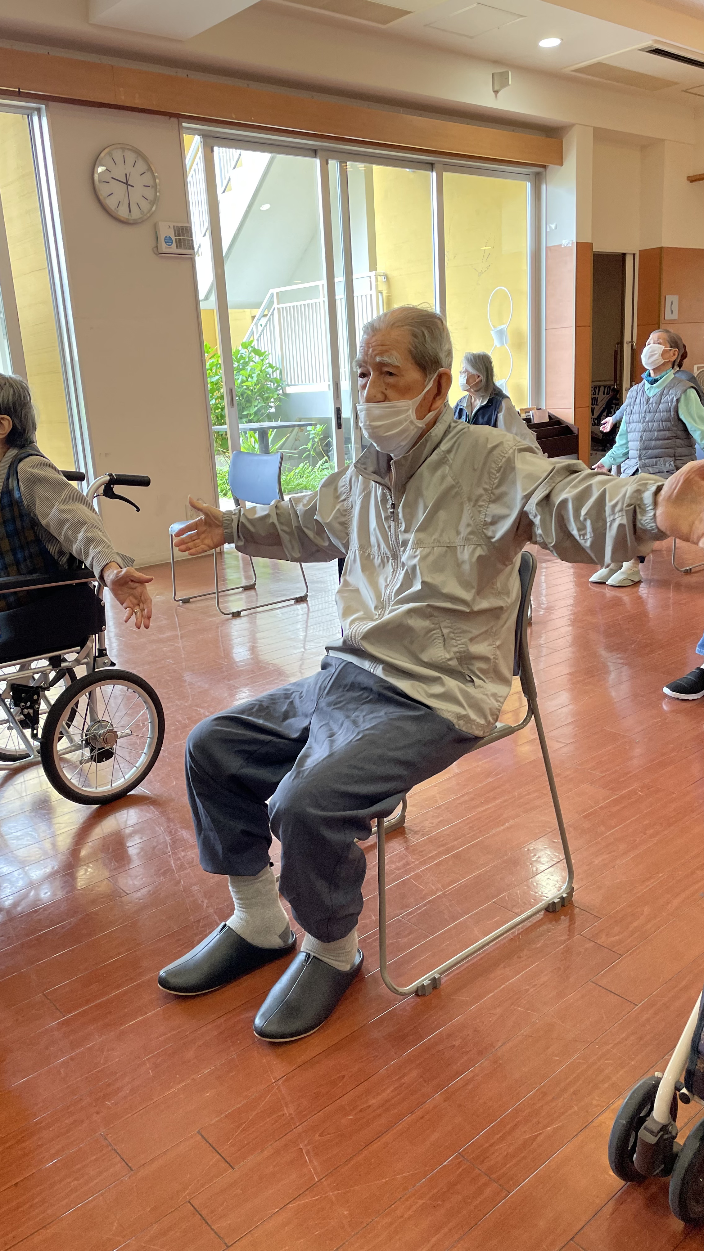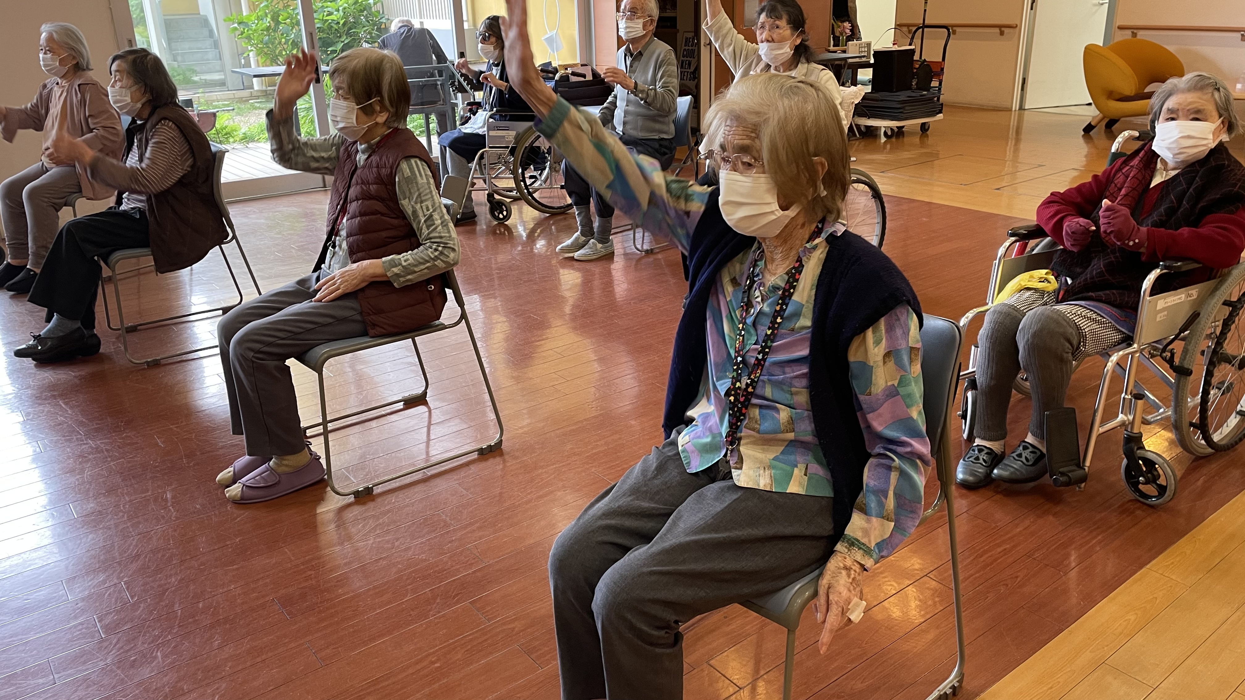 サザエさん体操で朝から身体を動かし