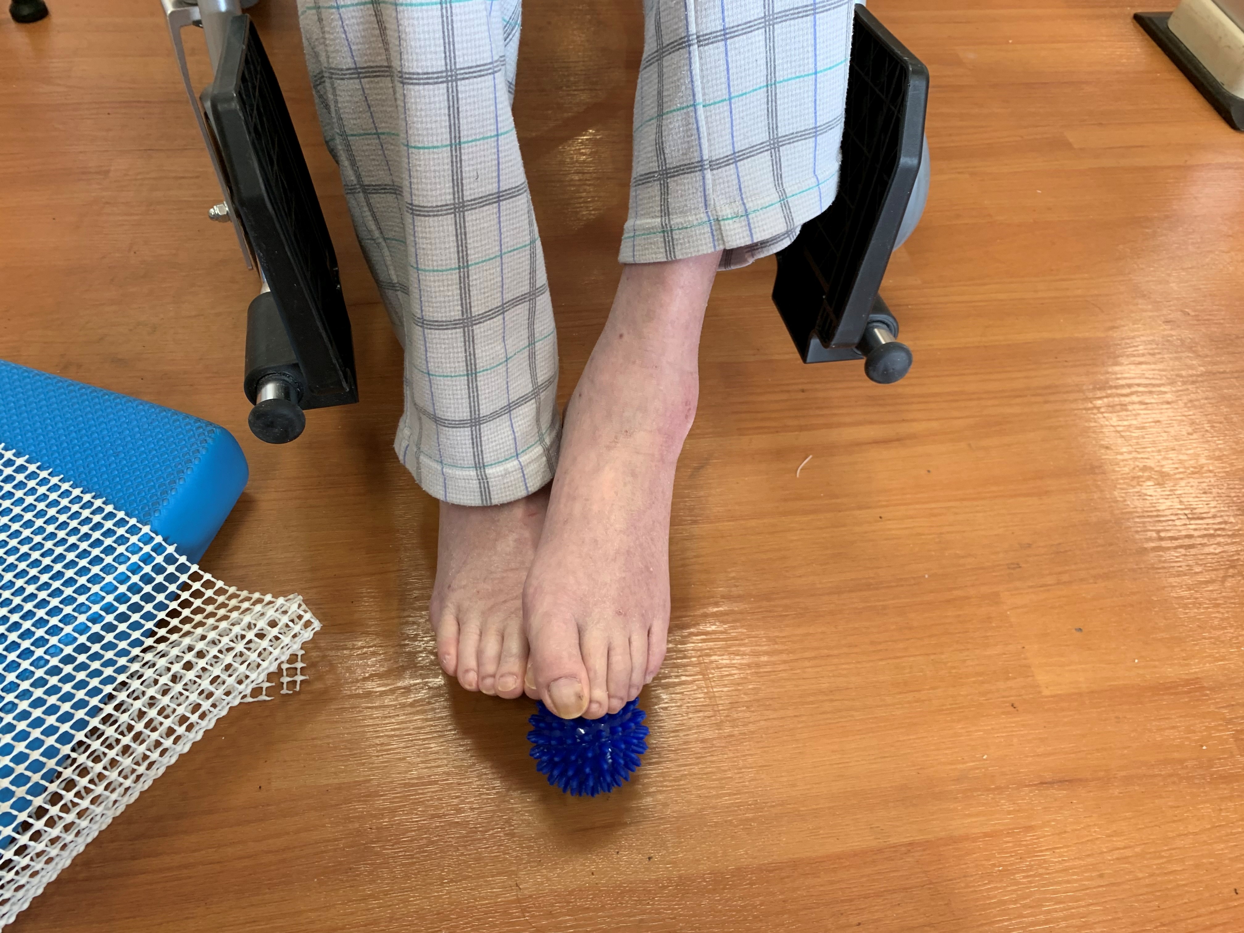 車椅子の方などは足底から刺激が入りづらいためトゲトゲのボールを使って行っています‼︎‼︎