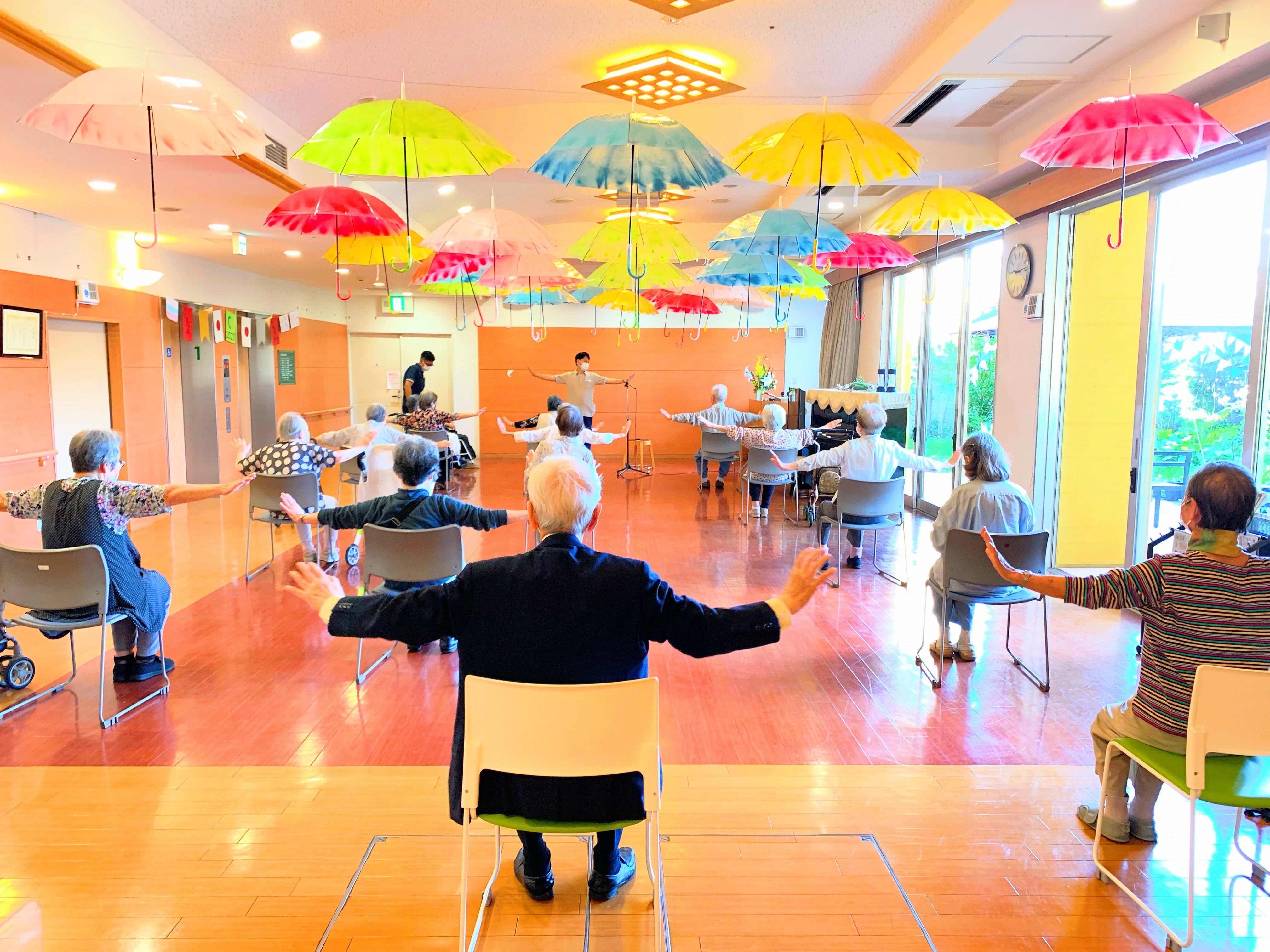 ホールに集まり体操です