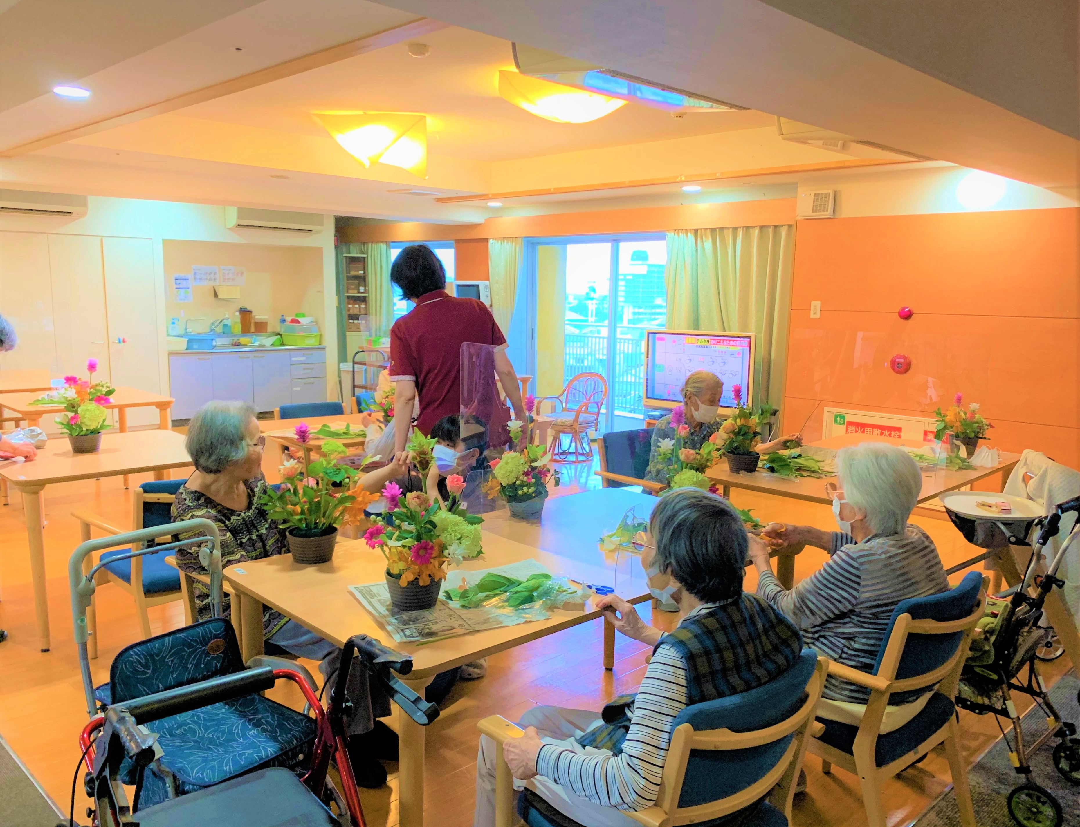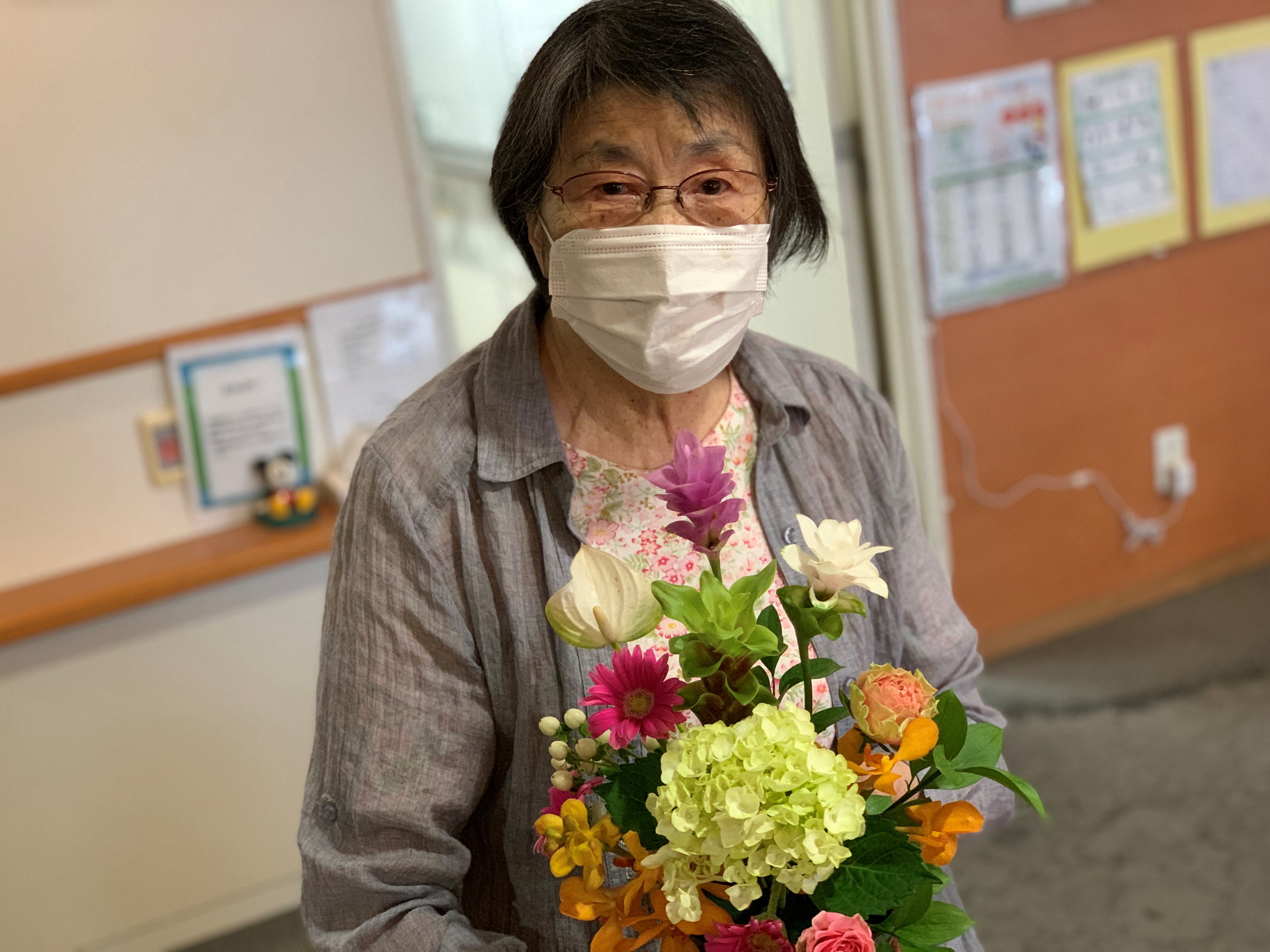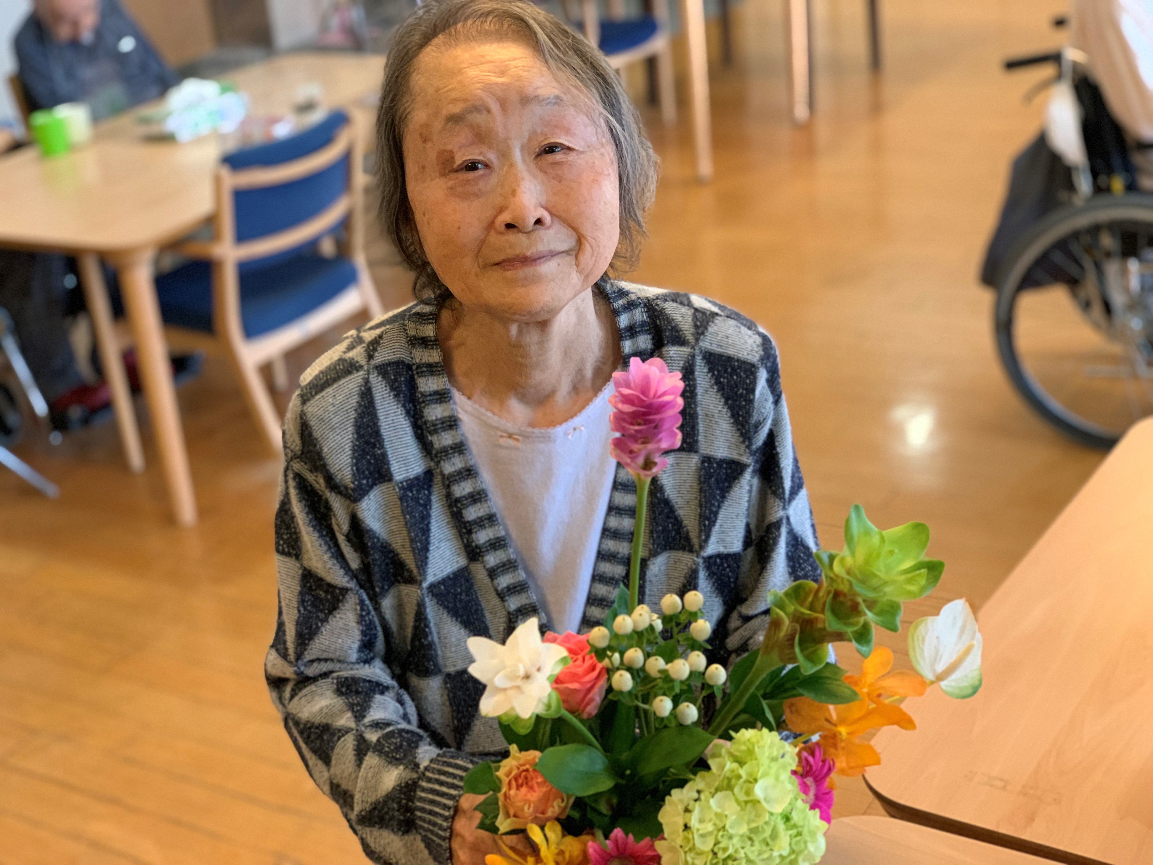 こんにちは、今日は花と一緒に写真撮って〜と入居者様にお願いされたので撮らせていただきました〜)^o^(