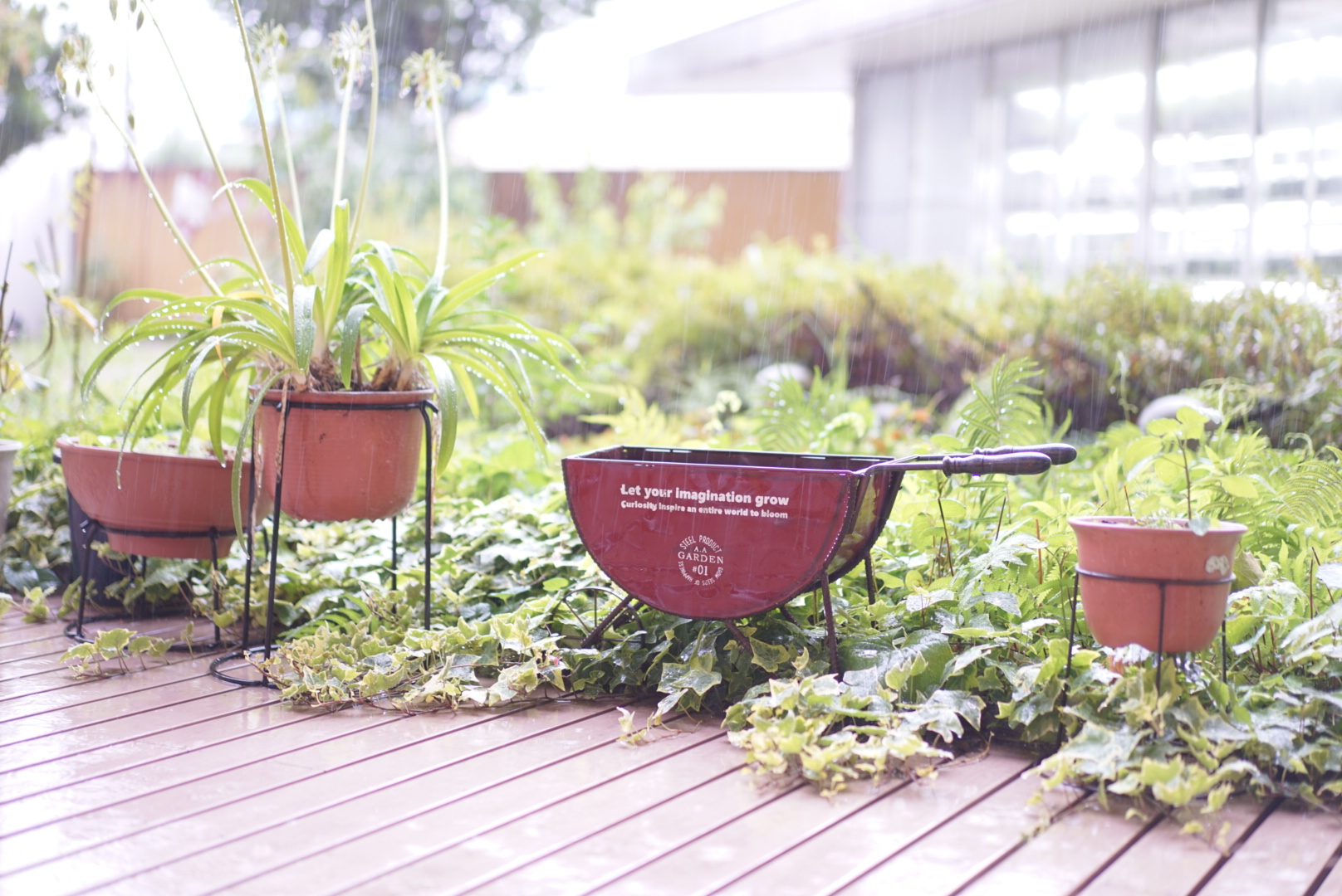 中庭の緑が雨に濡れている
