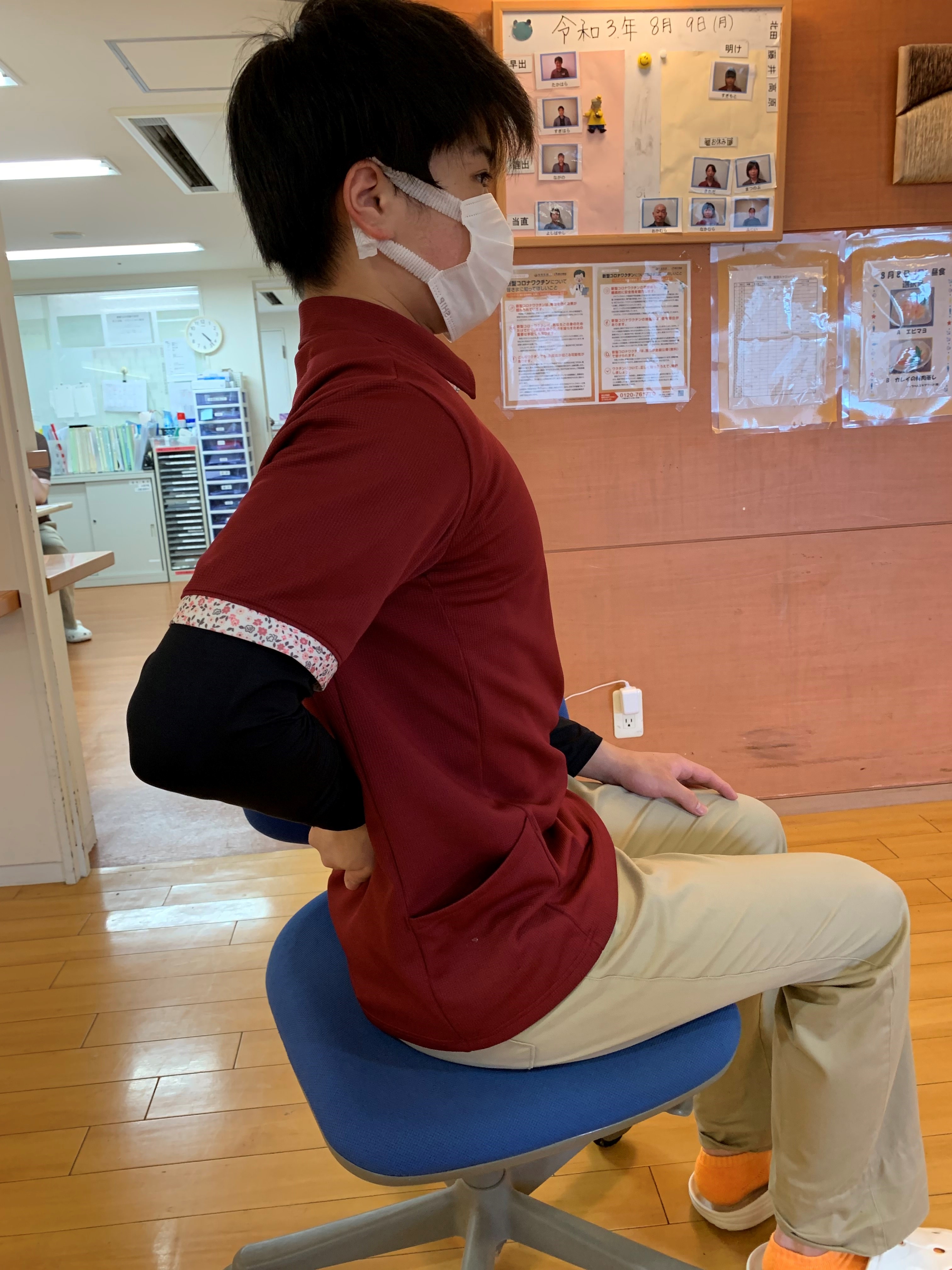 痛む方の手で腰の真ん中ぐらいを軽く抑えこれも20秒キープで2セット行います‼︎‼︎