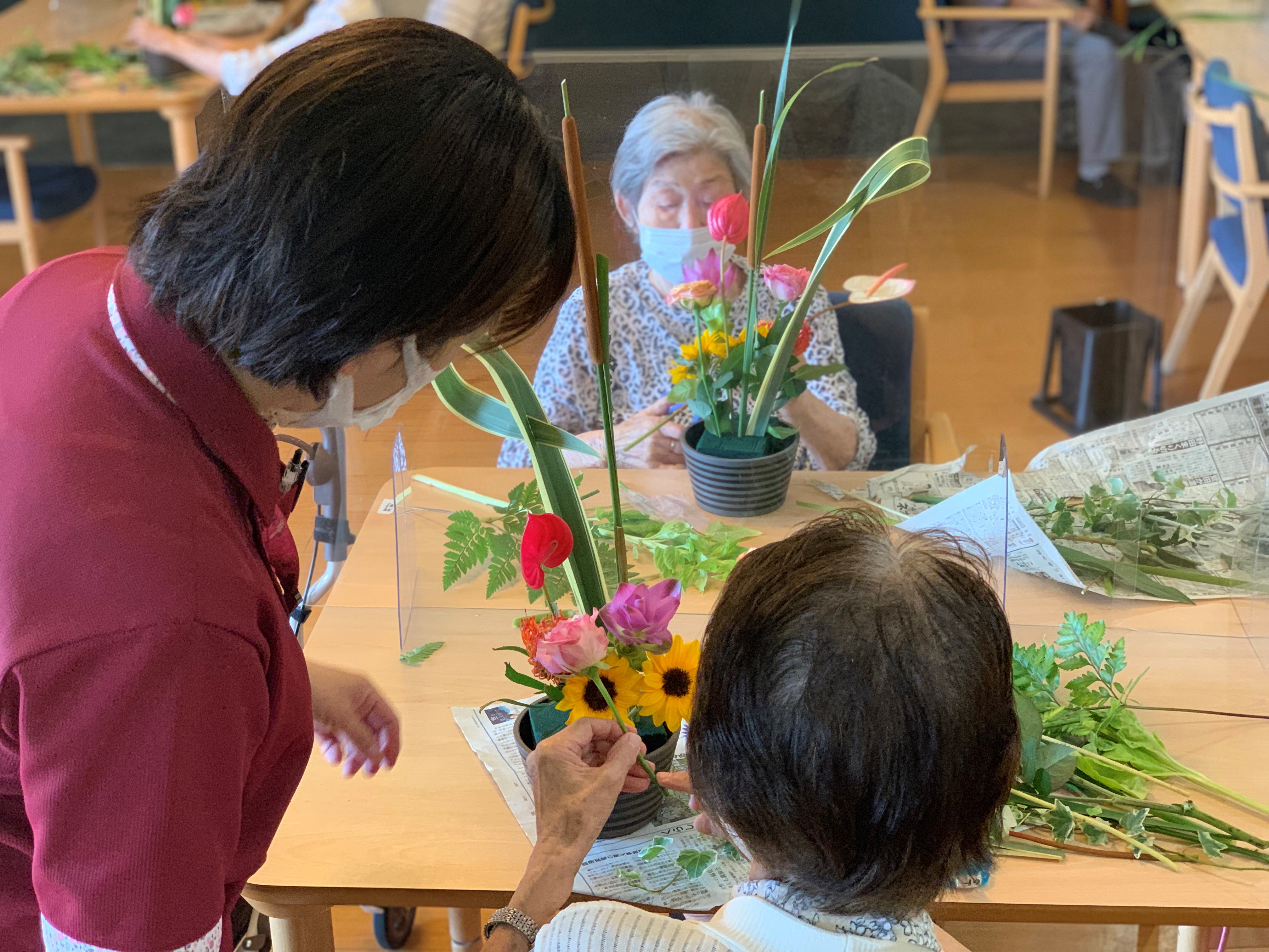 髪の毛を短くカットされたスタッフのKさんとI様が相談されながら花をいけておられました‼︎‼︎