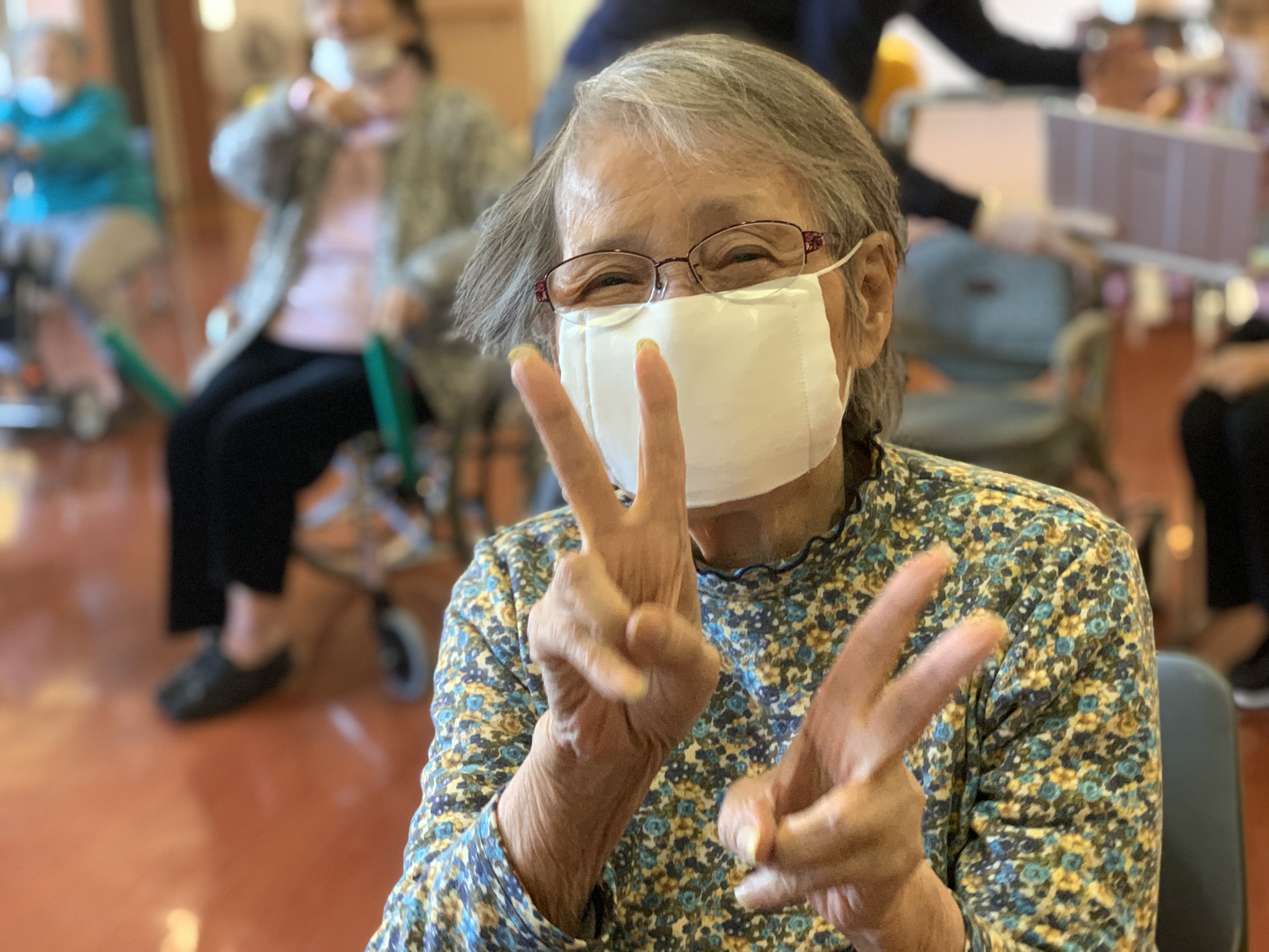 今日はH様にA様が「暖かくなってきたね、一緒に体操しよ」と優しく声かけしてくださり参加されました(o^^o)