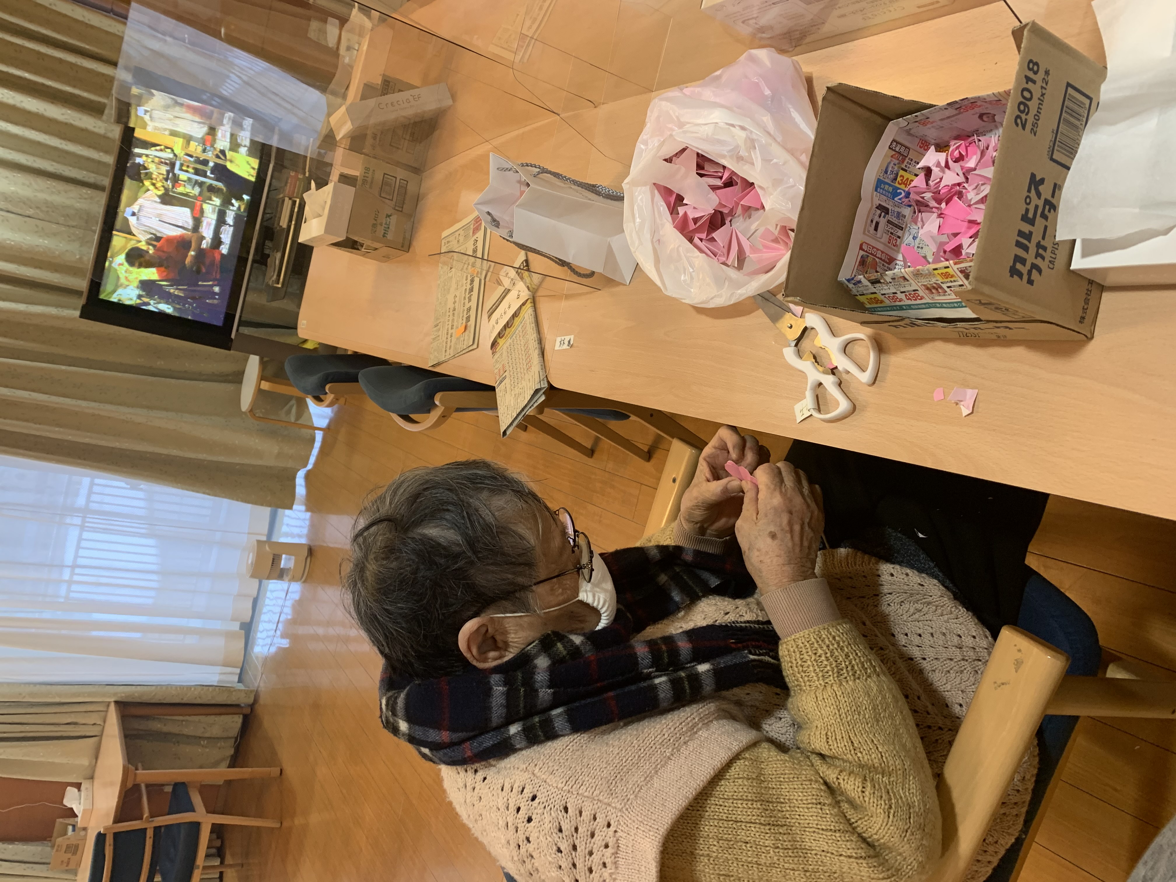 折り紙で桜を作っているのですが、「ここはこう違うの??」「ほんまやわぁ」とお二人で協力されながら行われていました!!!!