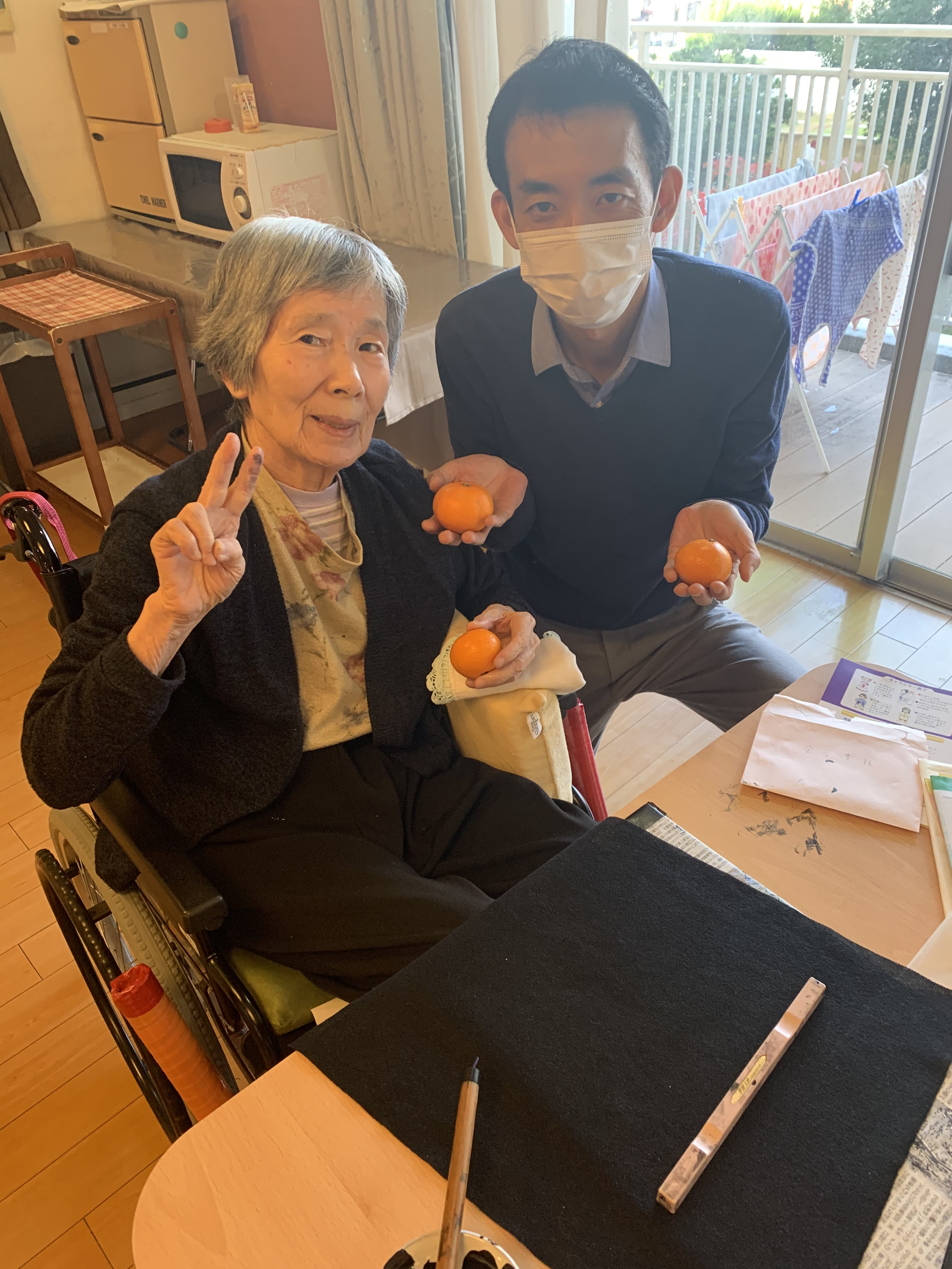 今日はリハビリ室のあるフロアで絵画・書道が行われていたので先輩PTのHさんT様の季節を感じるみかんとのスリーショットです笑