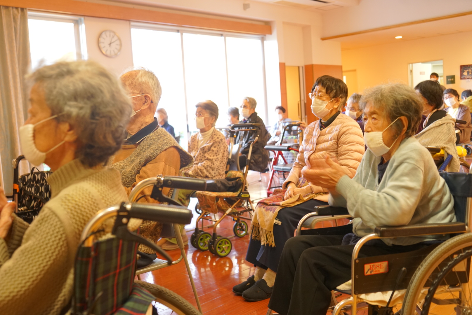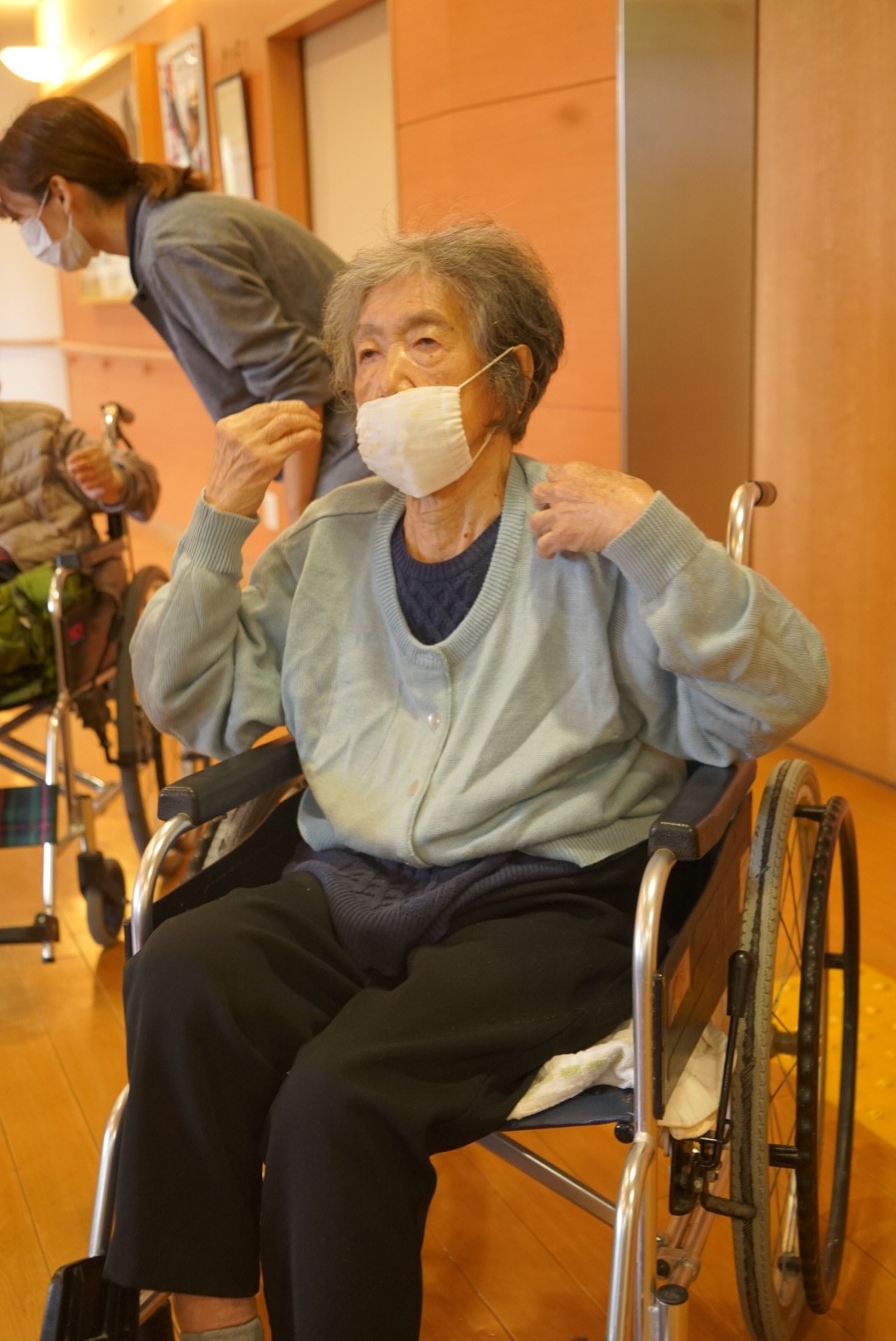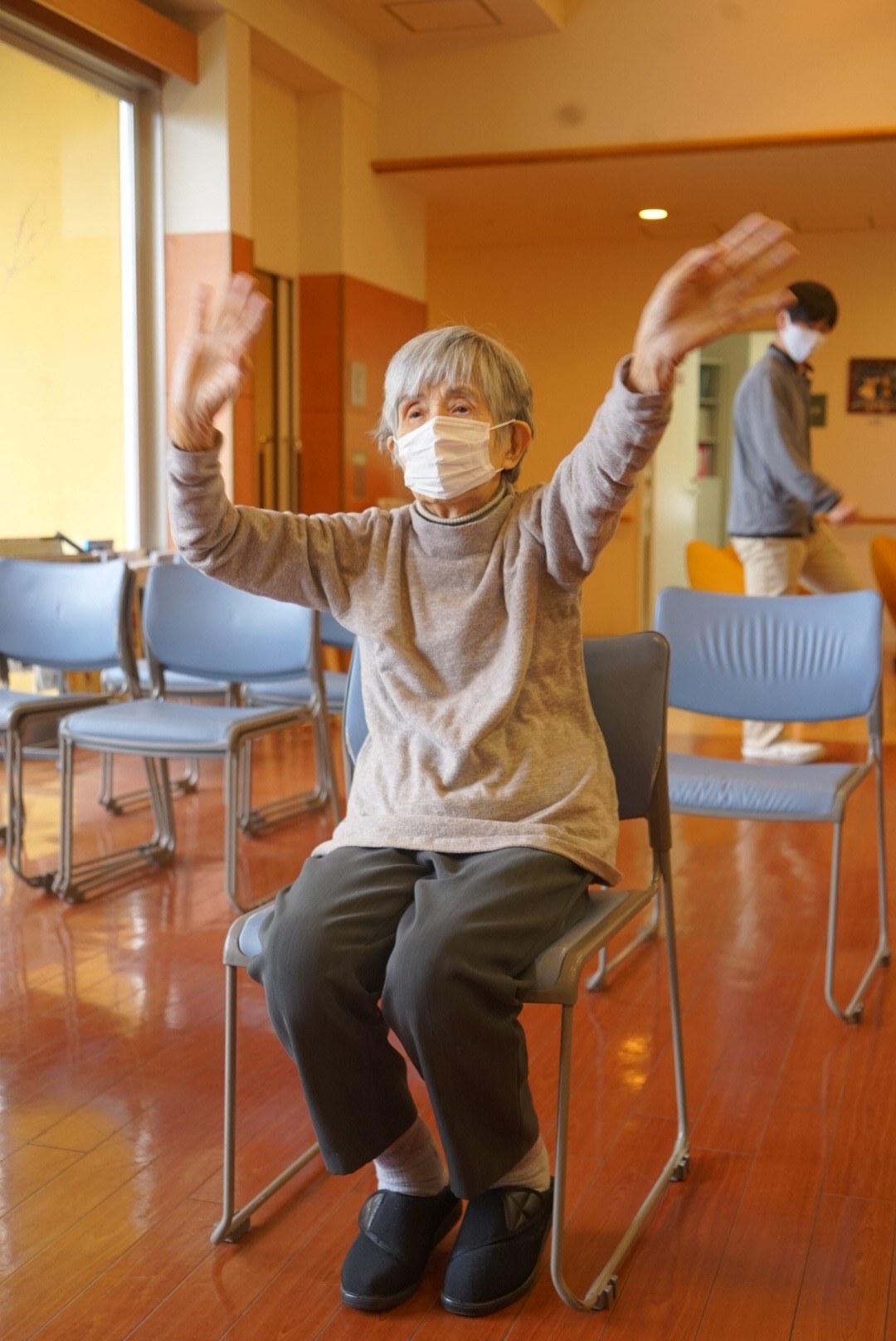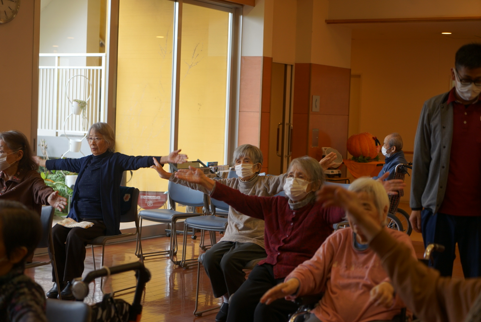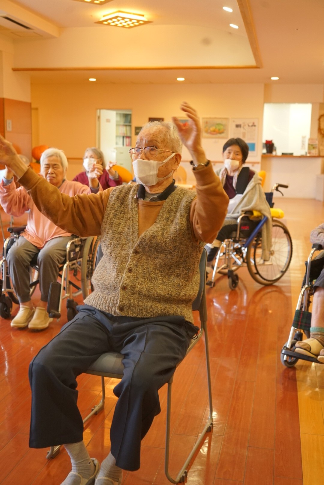 意外ともたれずにやるのは大変ですが、N様はもたれずきっちり腕の上げ下ろしができておりました‼︎‼︎いろんな体操に積極的に参加して頂いており、体も元気ですね(^O^)