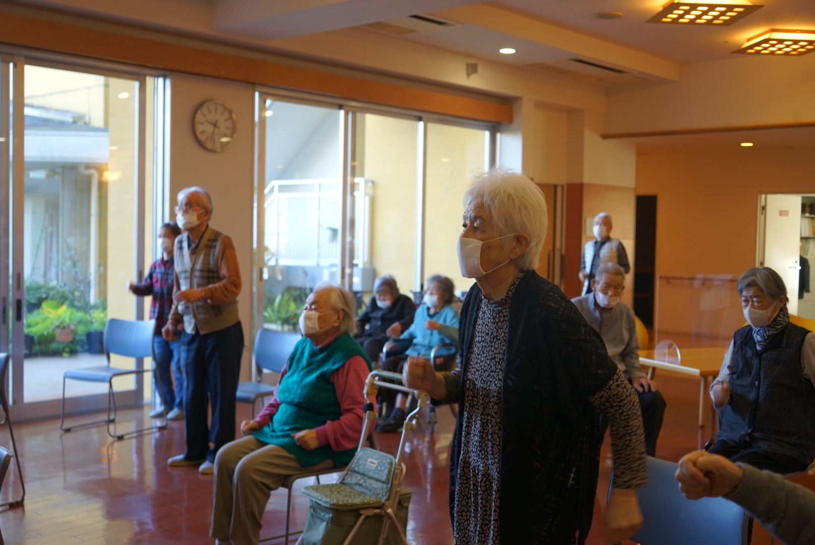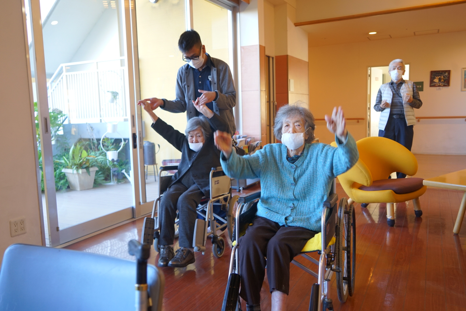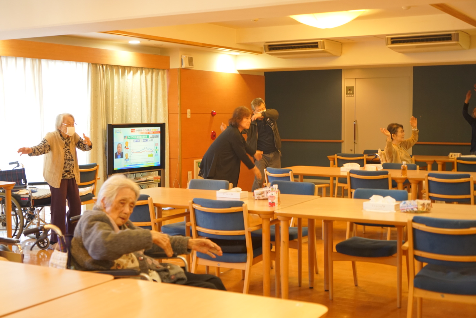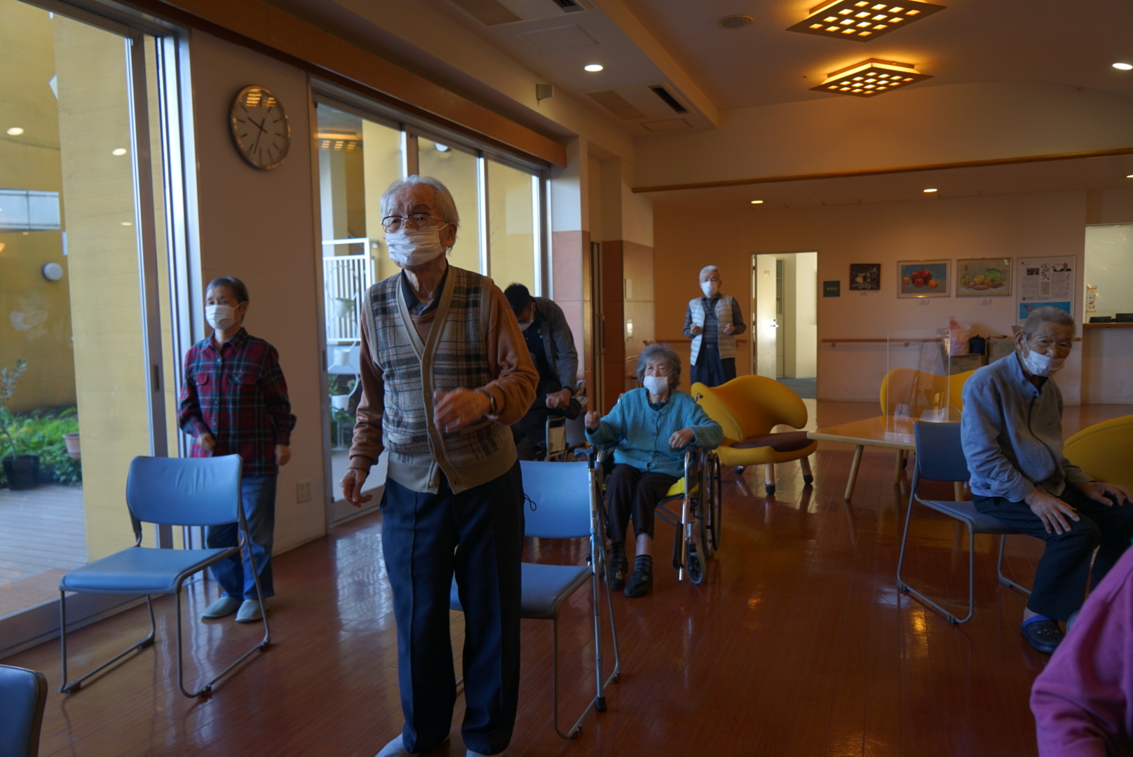 スタッフをお手本に体操されていました。