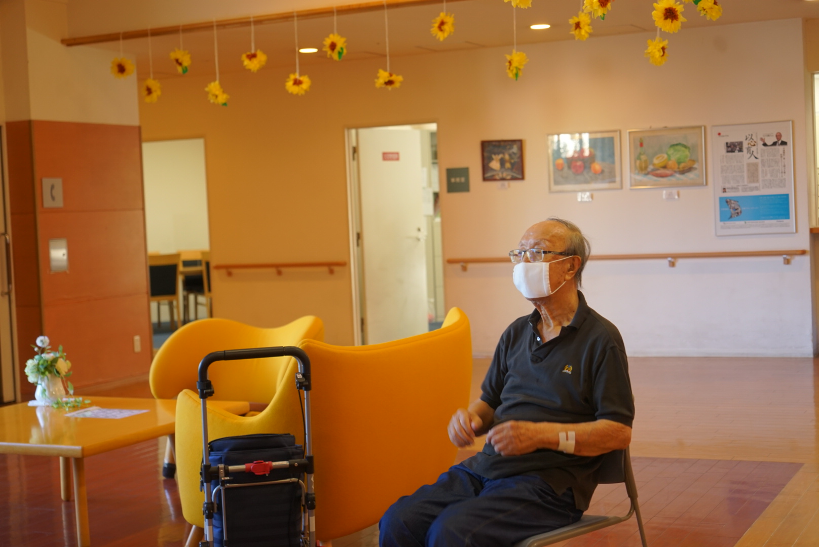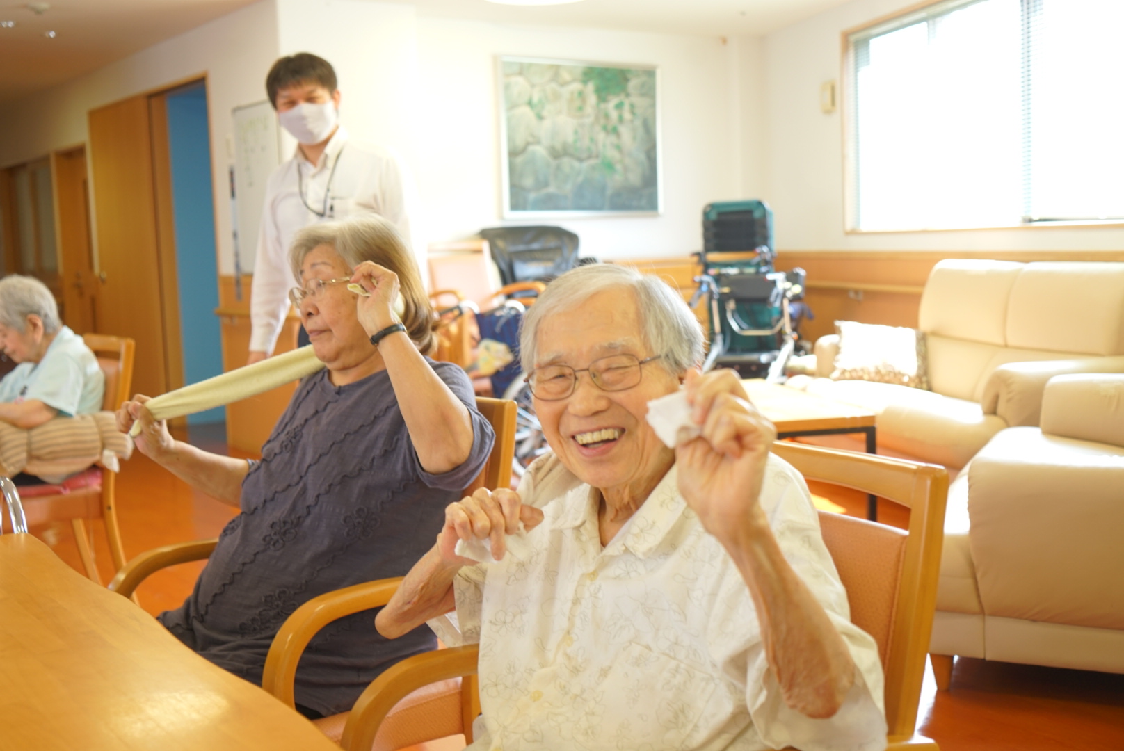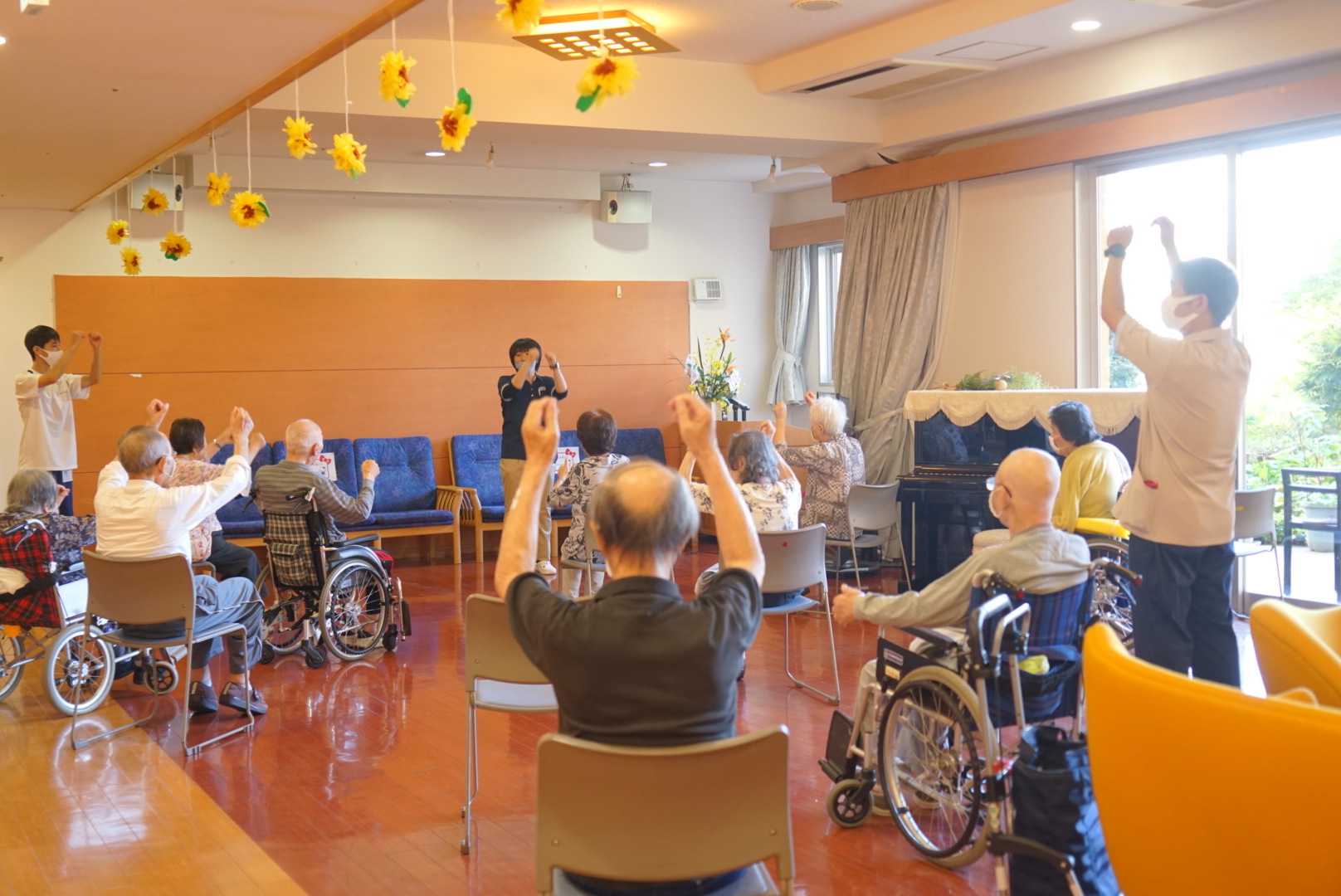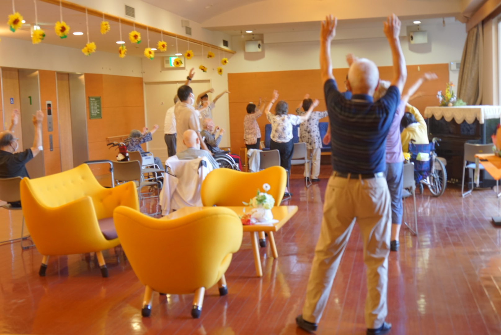 午前中は、施設の中の見学、サザエさん体操【転ばない体づくり】と高齢者の事を少し学んでもらいました。