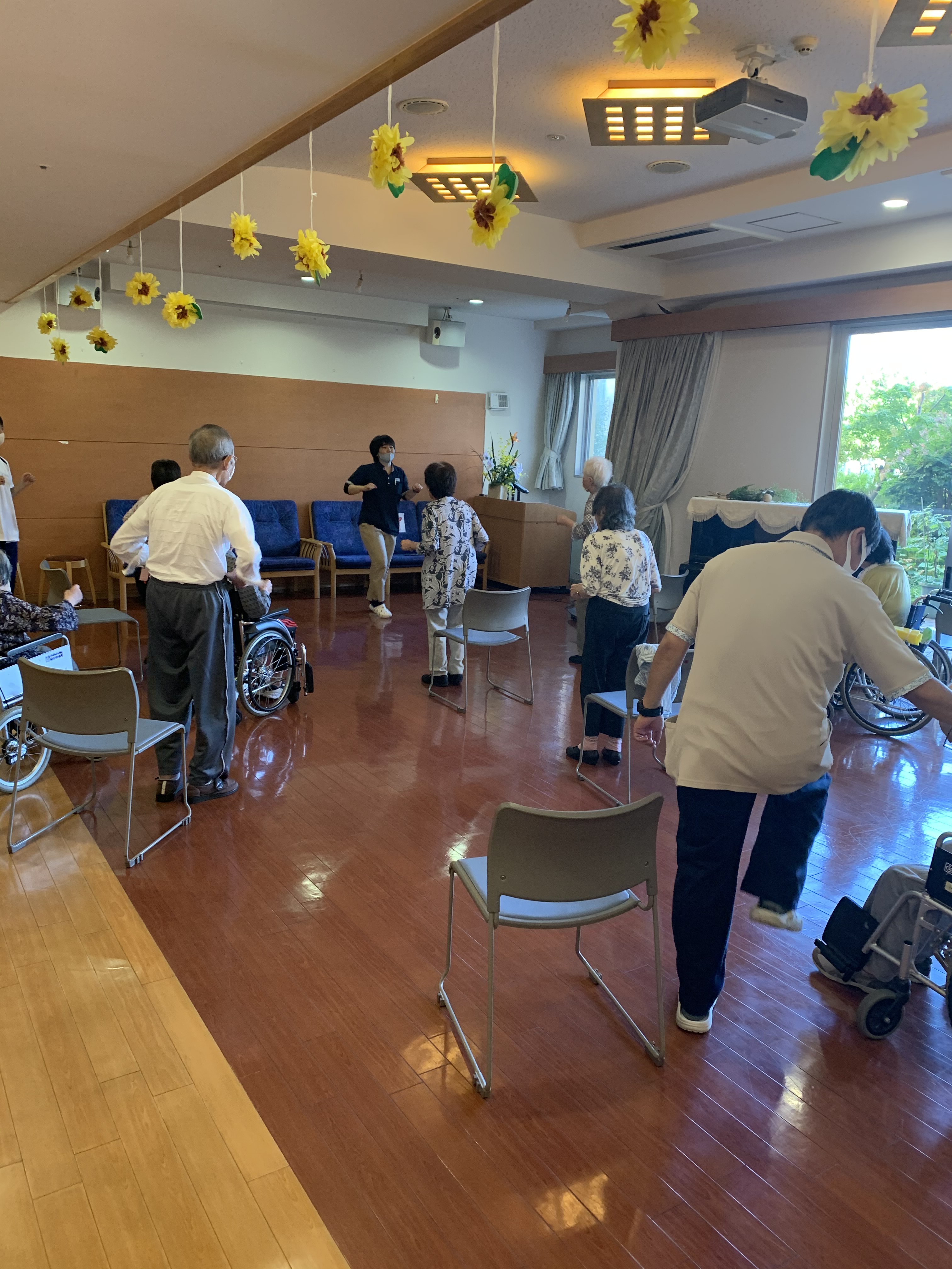 ある入居者間は「左の足上げるの苦手やから頑張ってんねん」と自分の体の特徴を考え取り組まれています。皆さま、サザエさん体操の日を楽しみにして頂けてリハビリは幸せです!!!!
