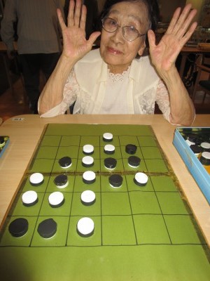 今日はリハビリ終わりに「頭の体操しよう~」と言われ少し時間があったので入居者様のK様とオセロ勝負を行いました!