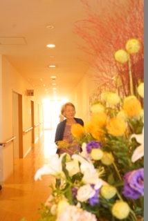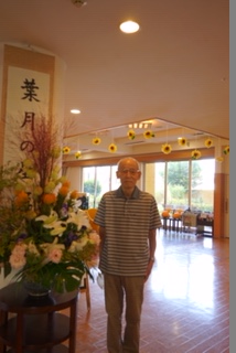 ご自身の書かれた掛け軸とお花の前で