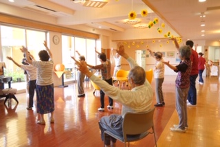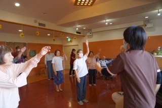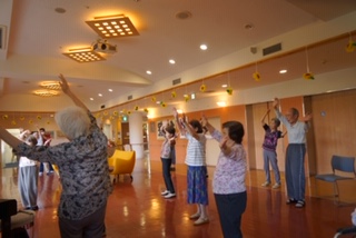 皆さん、立ち姿勢を保持しての体操です。