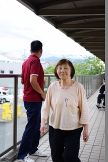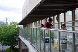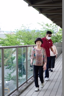 渡り廊下での歩行は風も気持ちよく