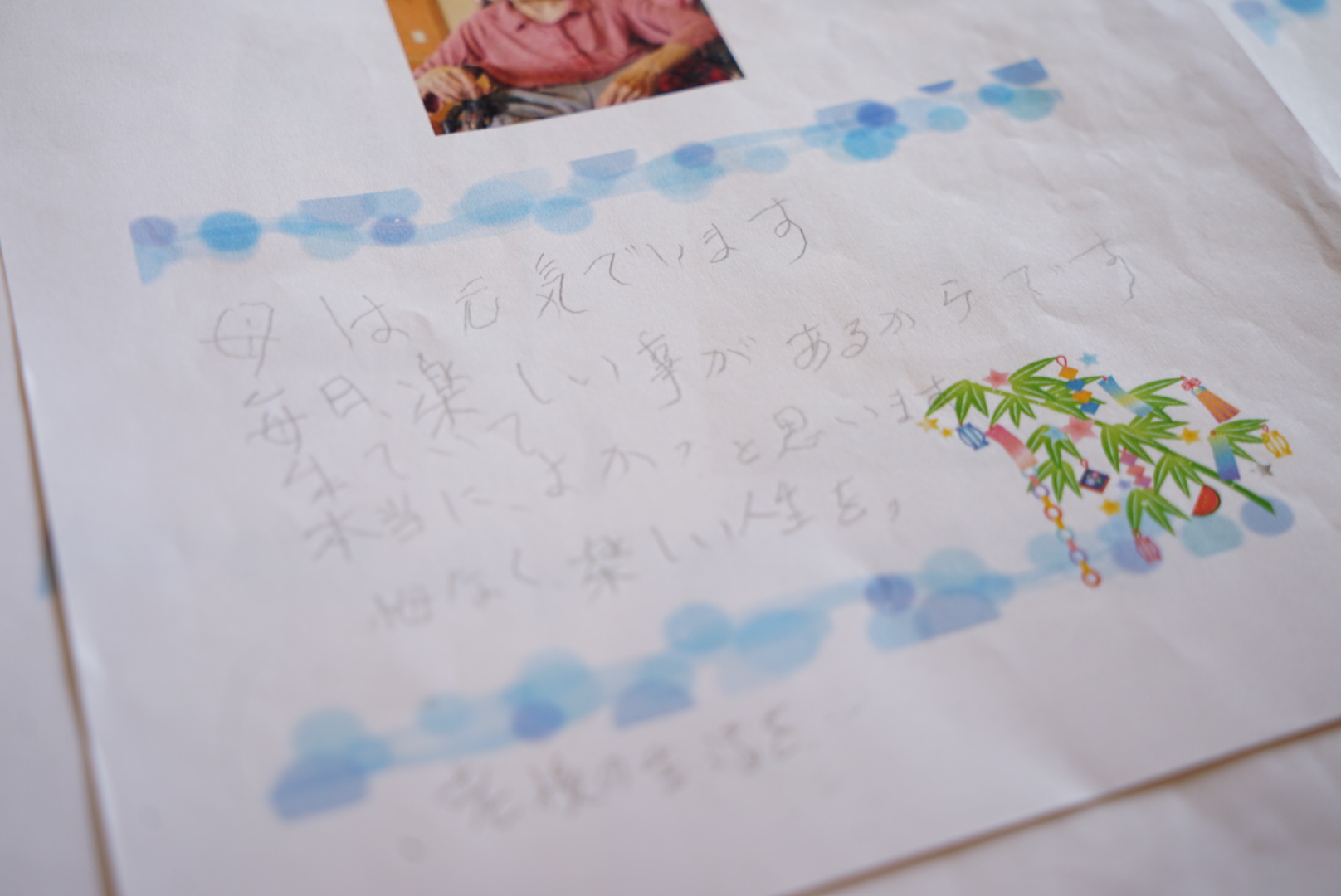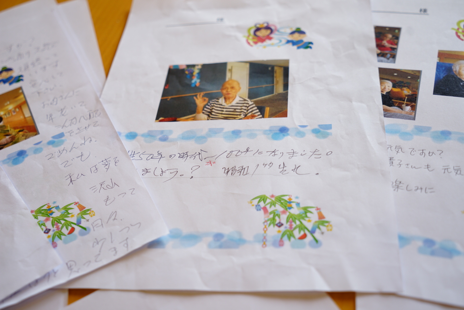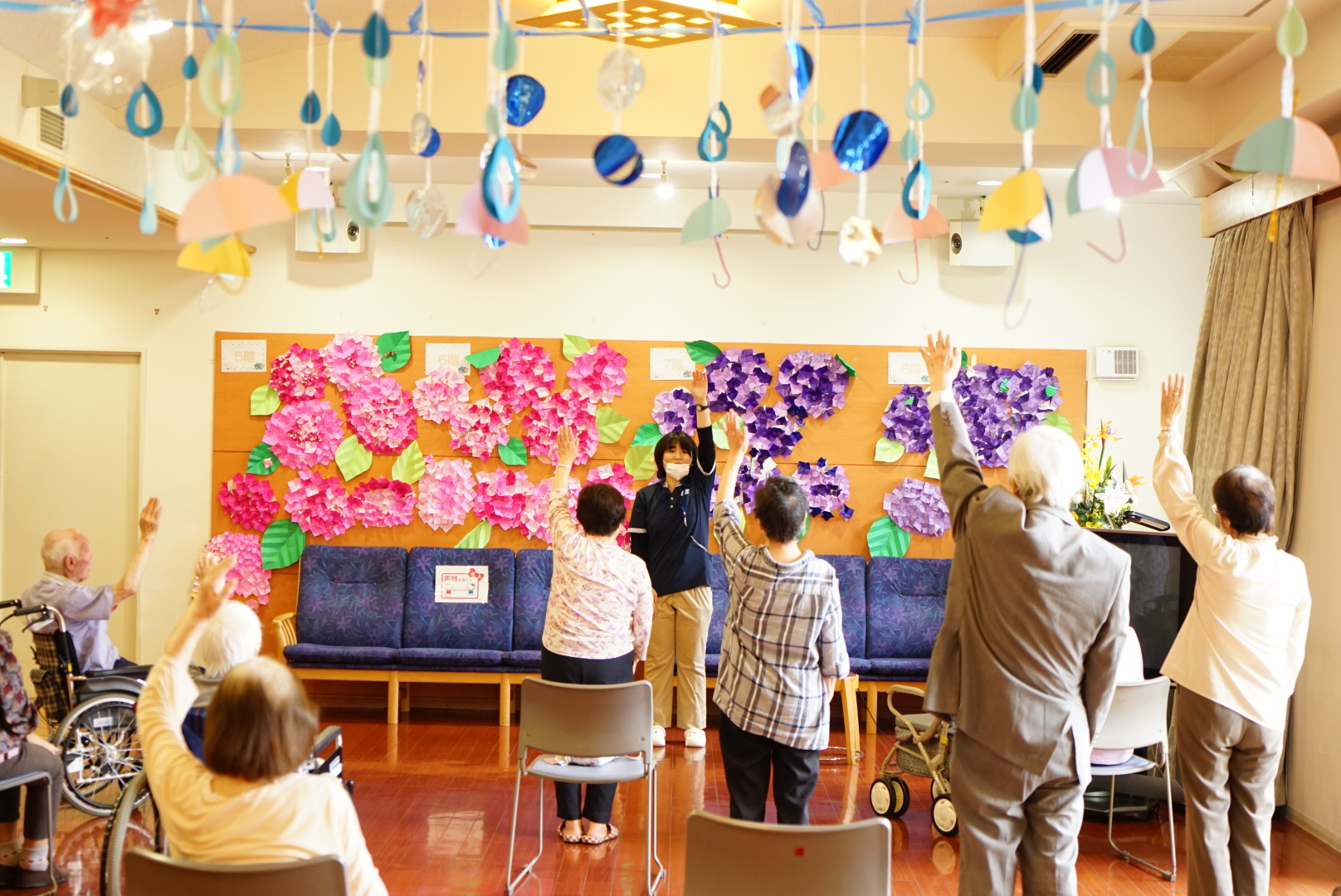 「毎日紫陽花の花弁を折ったり、縁日へ遊びにいったり、楽しい日々を送らせてもらっています。雨が降っても歌を歌ったり、おしゃべりしたりで退屈しません。」
