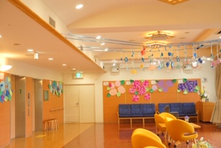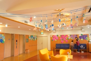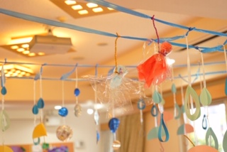 ロビー室には、可愛い てるてる坊主が