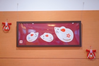 施設では、来年の干支であるネズミの日本手ぬぐいを額に入れて