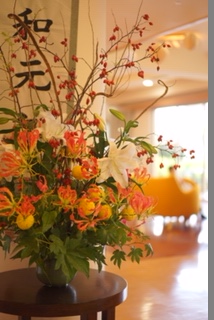 玄関のお花は、カサブランカが開花しロビー室に
