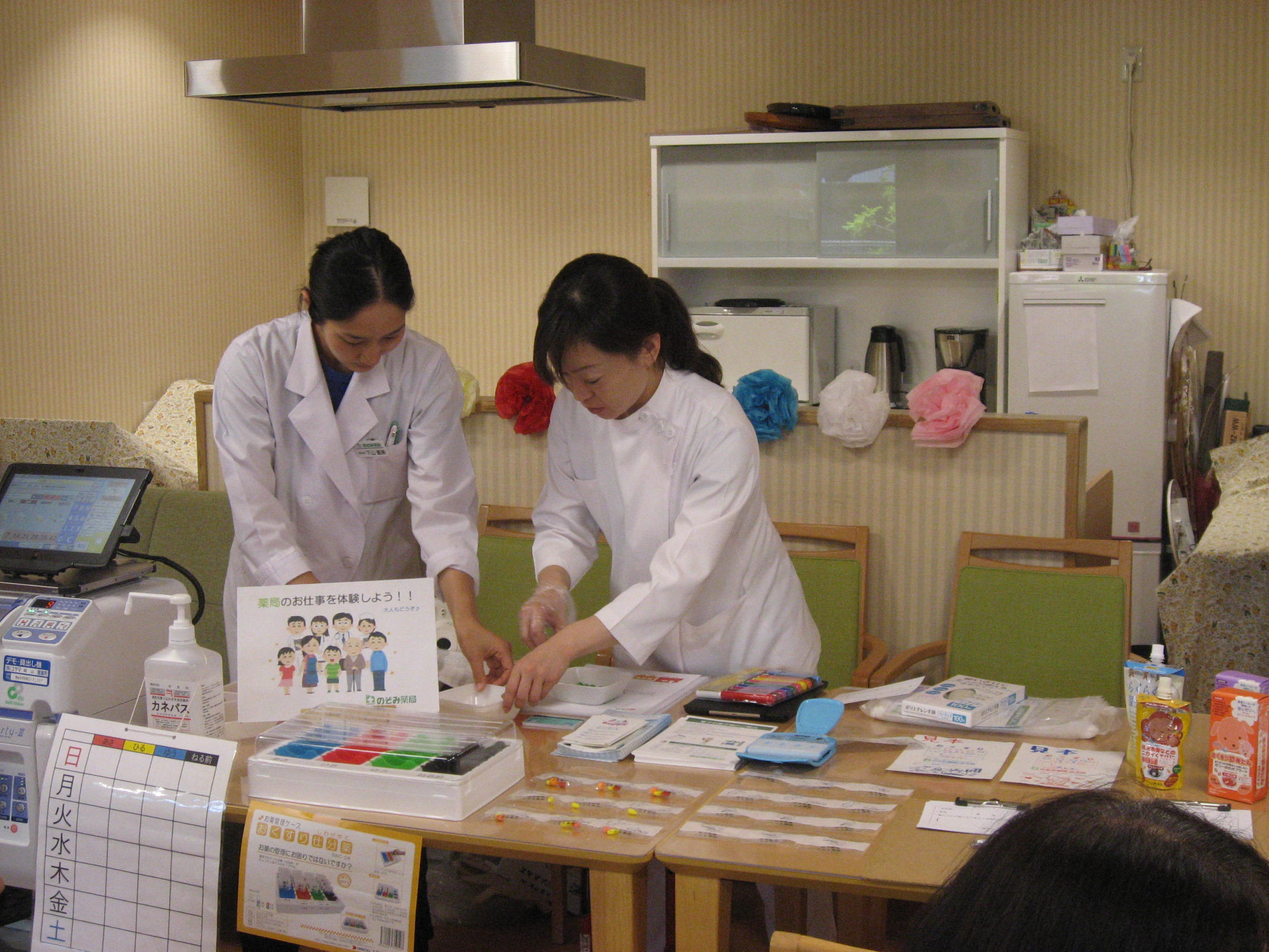 また、キッズ体験では、疑似薬局を行いラムネを薬にみたてて薬剤師さんと一緒に一包化にしたりと
