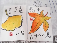 秋の落ち葉をお手本にして筆で描き、色付けをしました。
