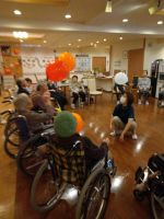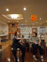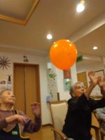 今月はハロウィン🎃の風船を二つ入れて楽しんでいただきます。大きい風船と小さい風船の二つが割れたり、風船がエアコンの風に吸われたりハプニングもあり、また、ハロウィンの風船が来る度に「お化け来た」と打ち返すご入居者様、途中からは「お化け」が「オバQ]になっていました((´∀`))初参加の方も笑いながら楽しまれていました。