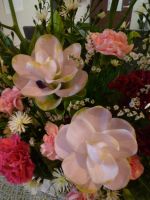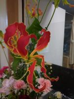 赤の「グロリオサ」が華やかで豪華さがあります。ピンクは「クルクマ」といって生姜の仲間だそうです。その他、クジャクソウ、セラムと名前を教えていただきました。