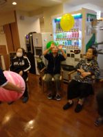 5つの風船がいつものように皆様の顔や頭に容赦なく飛んで来ます。途中、風船が割れてびっくりのスタッフ😲皆様は慣れたもんで風船を追い続けています。最後は手の消毒と水分補給です。一つの風船がほどけず男性のご入居者様に血(尻)圧で割っていただきました。「三、二、一」の掛け声と共に皆様は耳を抑えながらもお顔は興味津々・・・割れた瞬間、拍手喝采👏でした。今日もお疲れ様でした(^^♪