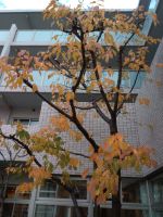 河津桜の葉が黄色くて綺麗です。毎年今頃は葉もなくなり木だけですが気候のせいなのか今年は葉がかなりついています。リハビリコーナーと2階リビングからの眺めも良いです🍁