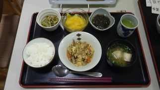 本日の昼食(DS)のメニューは、ご飯・親子煮・ちくわとキャベツの炒め物・もずく酢・味噌汁となっております。