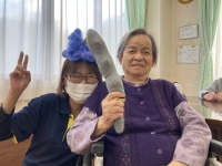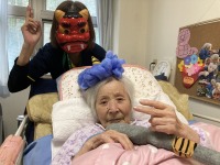 リビングの壁には、利用者様のお手伝いにより一足早く梅の花が咲き誇り、季節は一足早く春を迎えています。昼食には恵方巻を、<南南東>に向いて食べて頂きました。午後は赤鬼👹・青鬼に扮した男性スタッフに鬼は外・・福は内と威勢よく大きな豆を投げつけられていました・・・(^_-)-☆