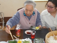 入居者様も職員も、最初は慣れない手つきで手巻き寿司作りに取り掛かりましたが、「美味しい!!」と個数を重ねるごとに綺麗な手巻き寿司になっていきました。普段野菜が苦手で最後までお皿に残されている入居者様も、お好きな具材と一緒にパクパク(*^^*)美味しい物を食べる時は静かになる。という時間がしっかり過ぎていきました。