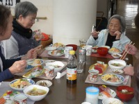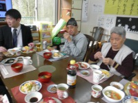 1月16日、1階入居者様とスタッフ合同の新年会を開催しました。施設長のあいさつの後、ノンアルコールビールでカンパ~イ(飲める方のみですが)、はぴねの畑で育った白菜を使ったお鍋、ちらし寿司、お刺身など喜んで召し上がっていただけた様子でした。