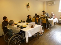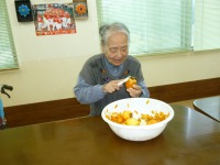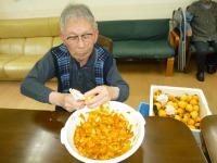 午後から3階の行事(干し柿つくり)で、2階フロアーに出向いて貰って3名の方が皮むきにチャレンジされました。一生懸命皮をむいておられ、日頃なかなか経験できないことができて良かったと思います。