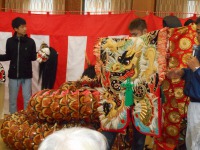 この休憩の後が、入居者様のドキドキの理由!! 今年は【鈴張神楽団】の方々に来ていただき『恵比寿舞』を舞って頂きました。ここでなんと!入居者様も太鼓で舞に参加!!神楽団の方々に来ていただき事前に練習をさせていただいたおかげで、皆さん最後まで演奏することが出来ました。(*^^*)また、神楽団様のご好意で普段触ることの出来ない、鬼面や衣装を触ったり、身に着けたりさせて頂く時間もありました。ここで皆様の笑顔が最高潮、本当に笑顔が沢山の楽しい時間を過ごして頂くことが出来ました。