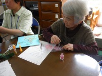 兜の模様はハートや木の葉等、一人一人の好みに合わせて入れることができ、とても楽しそうに模様を入れられ、「孫が来たら、あげるんよ」と嬉しそうに話しておられました。