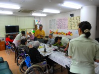 四季折々の懐かしい歌を聴かせて下さいましたが、「茶摘み」を歌われる時は総勢15名の方が入居者様一人ひとりに付かれ、手遊びをしながら一緒に歌って下さり、入居者様も自然と優しい笑顔になられ、終始和やかな雰囲気の中で楽しいひと時を過ごしていただく事ができました(^^♪