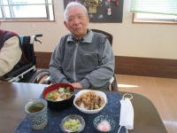 「何がでてくるかなぁ~?」と楽しみに…少しでも温まる食事をと手作りの豚汁を添え目の前に出てきた牛丼を見て「念願が叶った~」と喜ばれました。