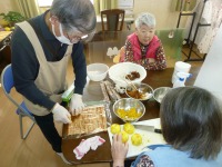 干し柿が食べ頃となり、今日は柚子巻柿を作りました。利用者様からは「初めて作るので分からん」・・・と、戸惑いのお言葉、巻きずしを作る要領でお願いしますと言うと、さすが、手際よく巻柿が出来上がりました。(^_-)-☆