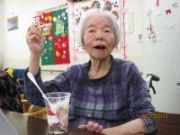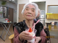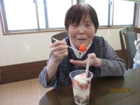 カップにカステラ・マシュマロ・生クリーム・アイスクリームを層にキラキラパウダーも!そして甘酸っぱいいちごの香りが・・・はぴねスイーツ店のオリジナルパフェが出来上がりました。「美味しいよ」「かわいいね」と残すことなく完食され春を感じて頂きました。