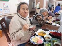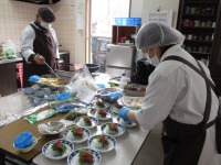 今月は2ヶ月に一度の行事食がありました。台所の勝手口を開けて換気をしながら、シップヘルスケアフードのスタッフの方が準備をして下さいました。