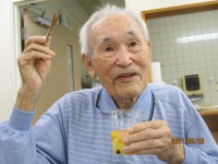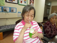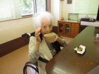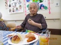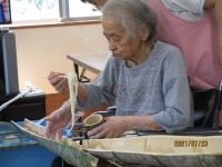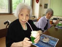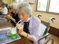 短冊に願い事を書いて頂き、どうか、願いが叶いますようにと手を合わせ、笹に飾って頂きました。おやつにはクリームソーダをお出ししたのですが…「こりゃあ、どがあやって食べるん?」「こがぁなものは初めて食べたよ!まぁ美味しいね」と大変喜ばれました。コロナ過の中、大変なおもいばかりですが、きっと願いは叶う事でしょう!