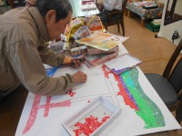 広島の宮島大鳥居の下絵に、PPバンドを切って貼り絵に集中。うっとうしい雨の日も皆様楽しく過ごされています。(^^♪