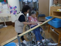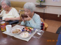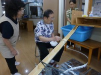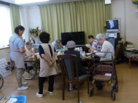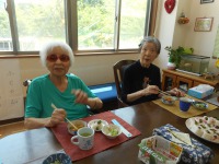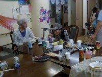 入居者様もお一人ずつ、流れ来るソーメンをゲットしようと頑張られ、楽しまれたご様子。先ずはビール?で、早朝より「いなり寿司」作りや諸準備の後での楽しい昼食会は、アットホームな感じでお過ごし頂けたものと思います。(^_-)-☆