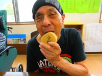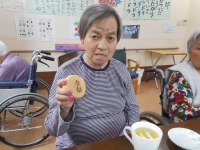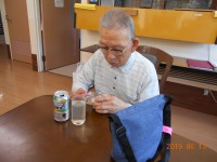 ハンドケアしたスタッフの手を握り、見まねで揉んだり、伸ばしたりと笑いながら時には擽ったりとマッサージをしてくださいました(笑い)。おやつにスタッフの手作りの牛乳寒天とノンアルコールカクテルを美味しそうに召し上がりました。