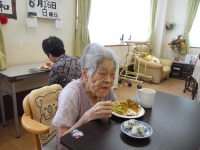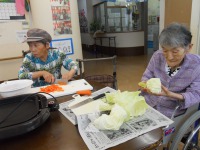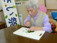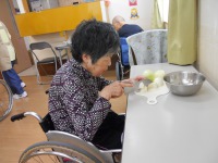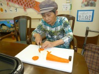 先ずは、お父さんに感謝の気持ちを込めて、普段包丁を持つことの無い利用者様に野菜のカットをお願いしたところ、さすが往年の主婦の復活です、普段見かけない輝いた顔つきに驚かされ、手つきもさすがでした。(^_-)-☆