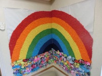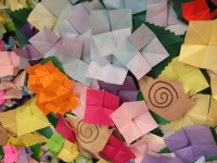 虹では、まずどの7色にするかを決めてもらい作業にかかり、紫陽花は細かい折り紙での作業と時々現れるカタツムリや渦巻を描く担当など、出来るパーツを協力しながら完成しました。