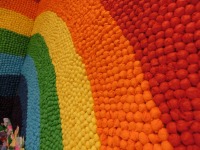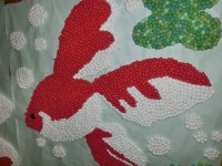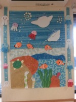 水族館・・様々な生き物を切り貼りし、ビニールテープで水をイメージ。巨大な金魚と藻はお花紙で作成し全体のバランスを調整するのが難しかったです。